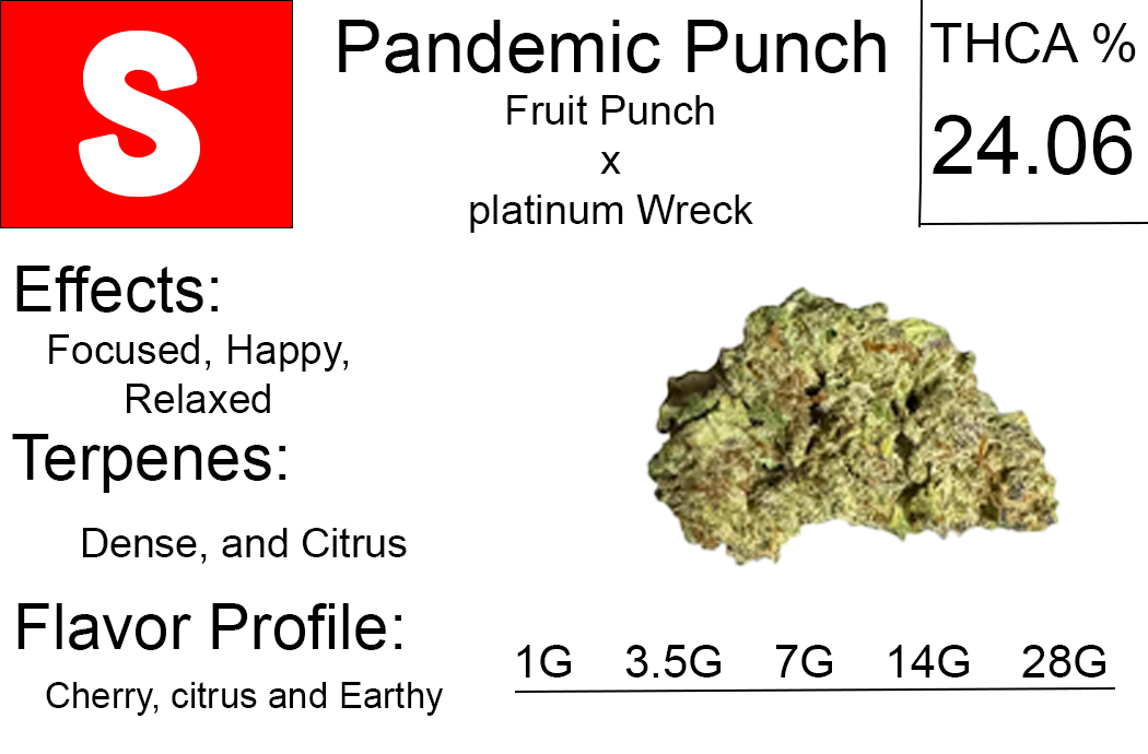 The ever-so-new Pandemic Punch! Get ready to knock out your cravings with Pandemic Punch, a sativa dominant hybrid strain that’s not just pleasing to the eye but also packs a punch.